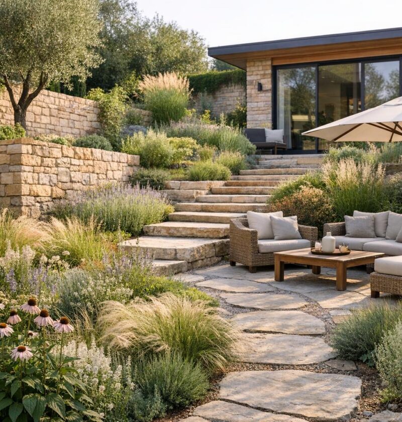 Wegesysteme aus Naturstein oder Holz schaffen klare Linien und führen Besucher durch den Garten. Gleichzeitig schützen sie die Vegetation und erleichtern die Pflege. Die Wege sollten in Material und Form zum Gesamtstil passen und harmonisch in die Umgebung eingebettet sein.